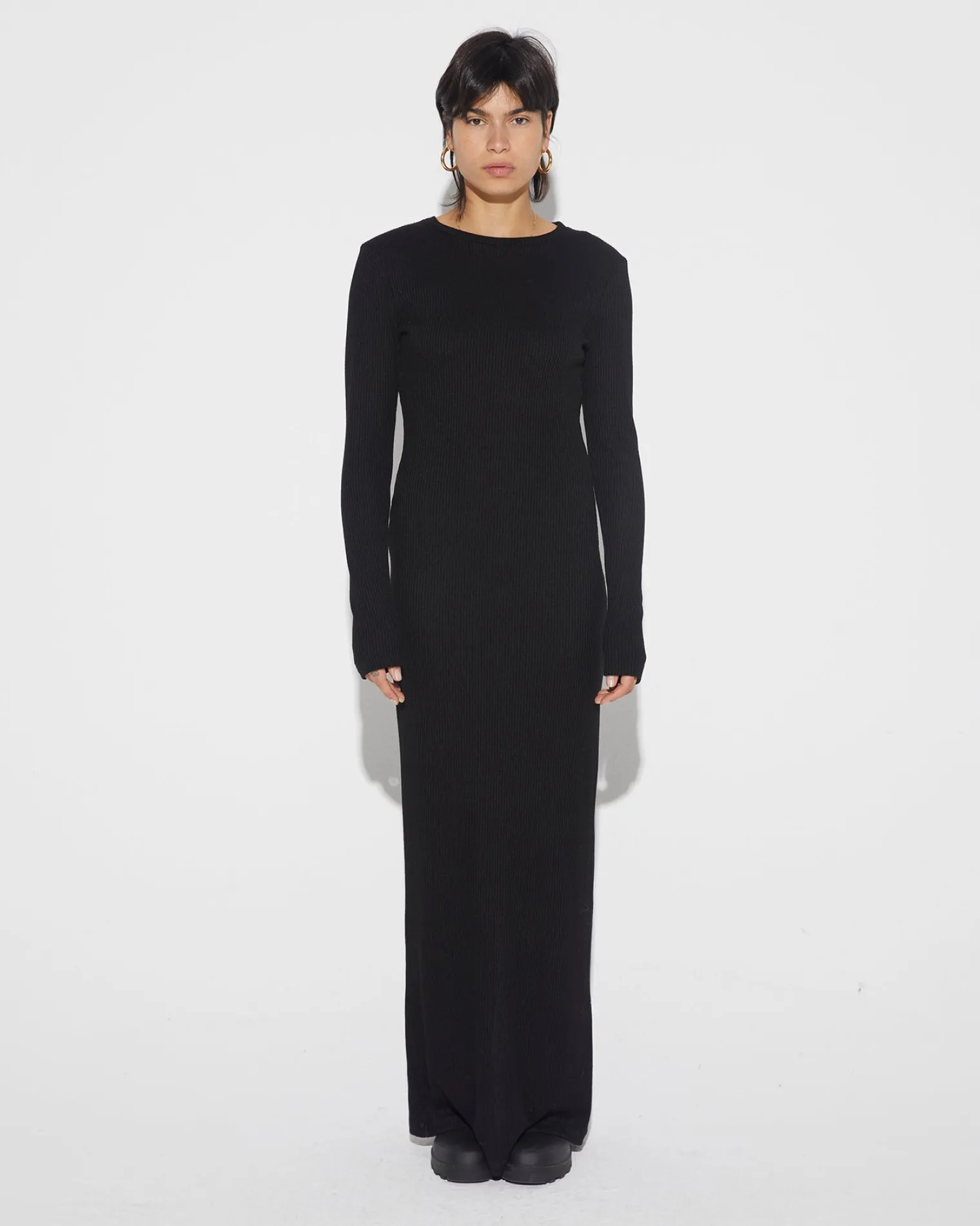 Meet The Chanda Dress, The Black Dress That Your Wardrobe Needs. The Long-Sleeved Black Ribbed Dress Hugs Your Body Like No Other. ITs Sleek Fit And Classic Black Color Will Flatter Your Figure. Look And Feel Your Best In Any Setting!