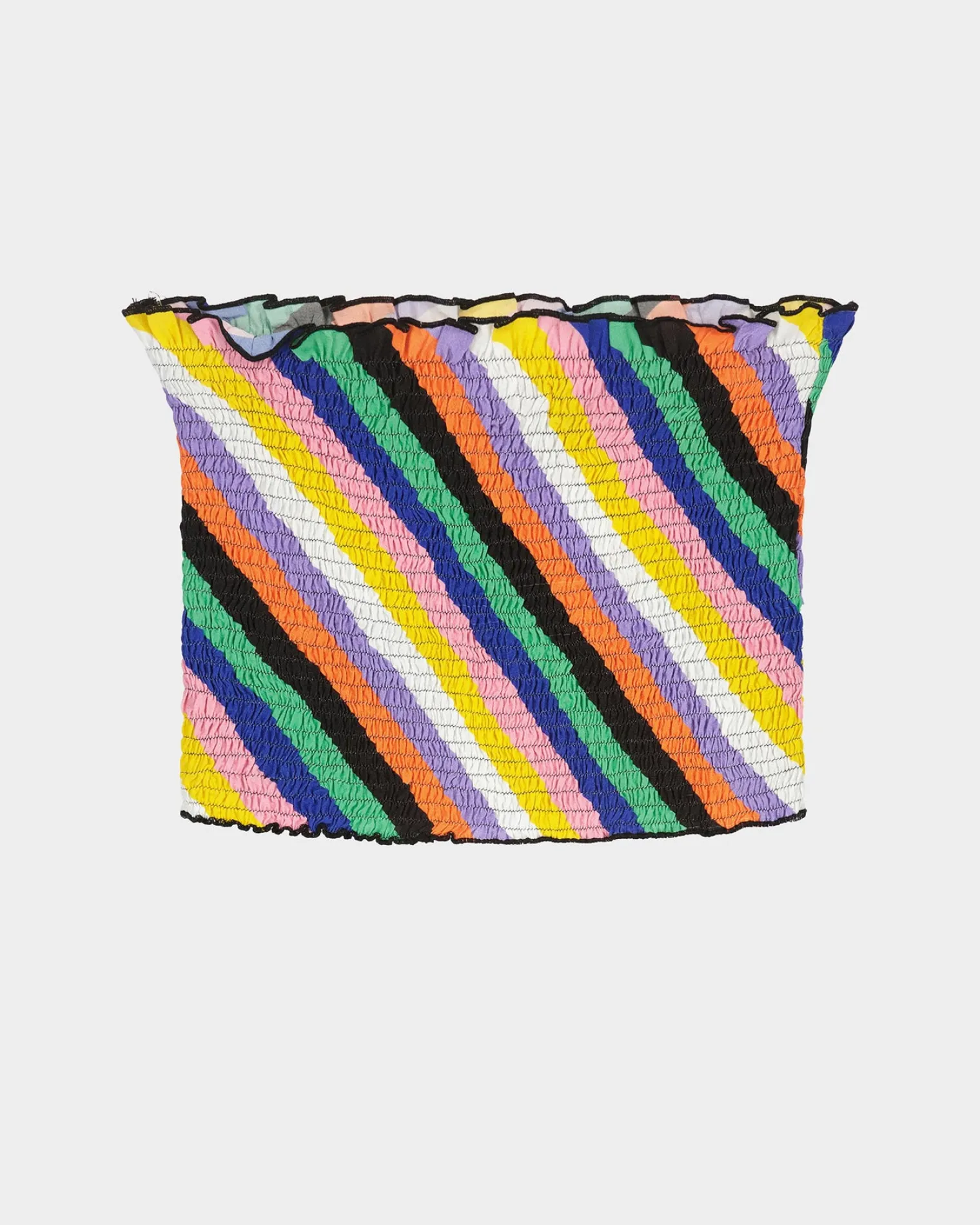 Take On The Summer In The Estel Smocked Top! Featuring A Bold Printed Multicolor Stripe, This Striking Smocked Bandeau Top Will Take Your Look To The Next Level.