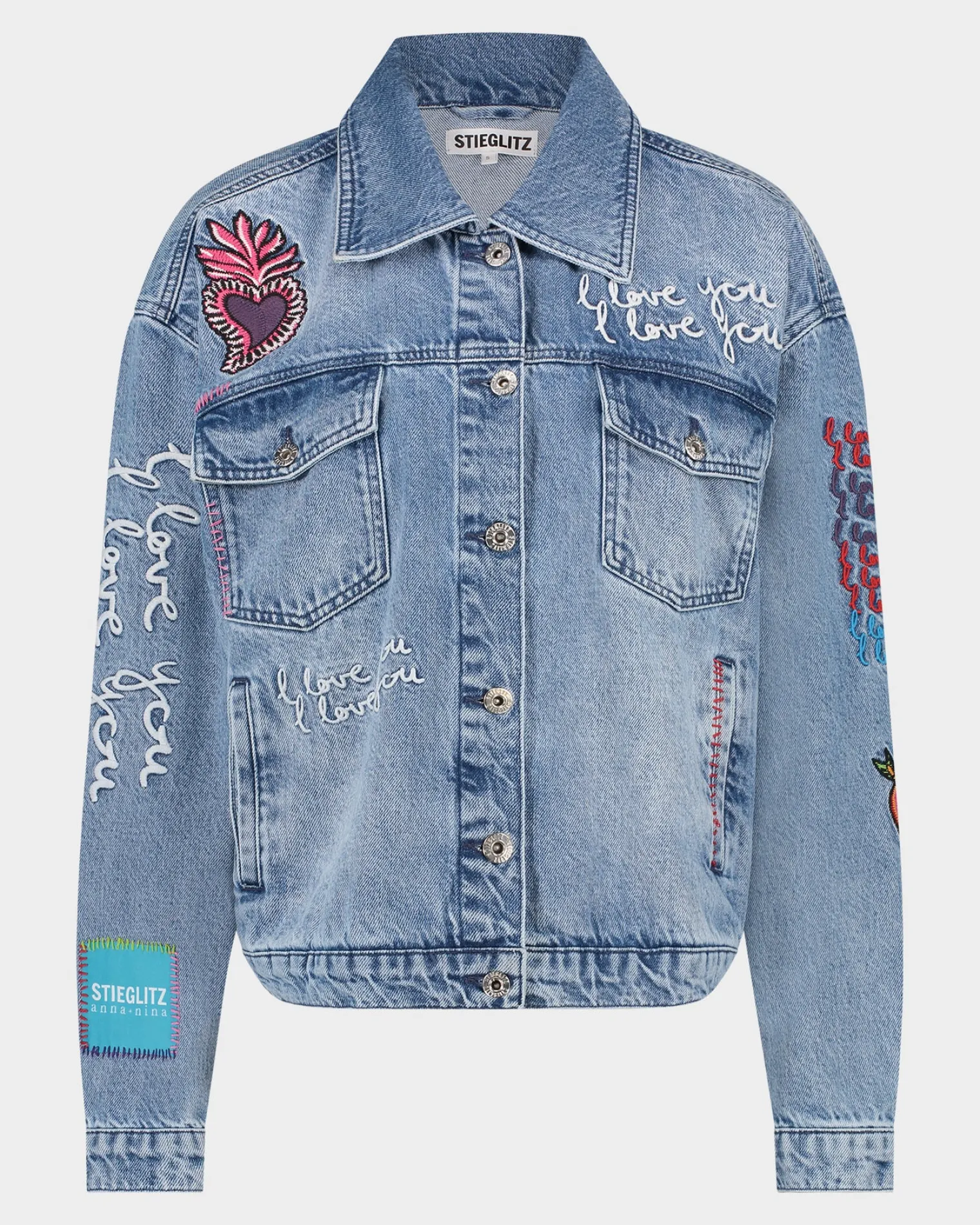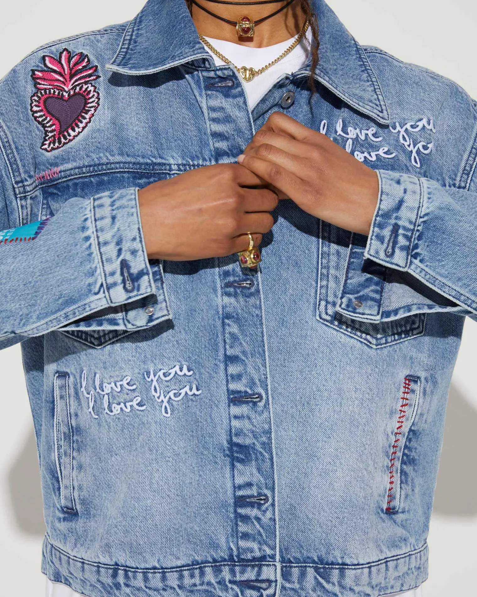 The Love Denim Jacket Is Made Using 100% Cotton. The Jacket Has A Slightly Oversized Fit And Has Embroidered Details All Over The Jacket. The Sleeve Features Our Logo Patch.