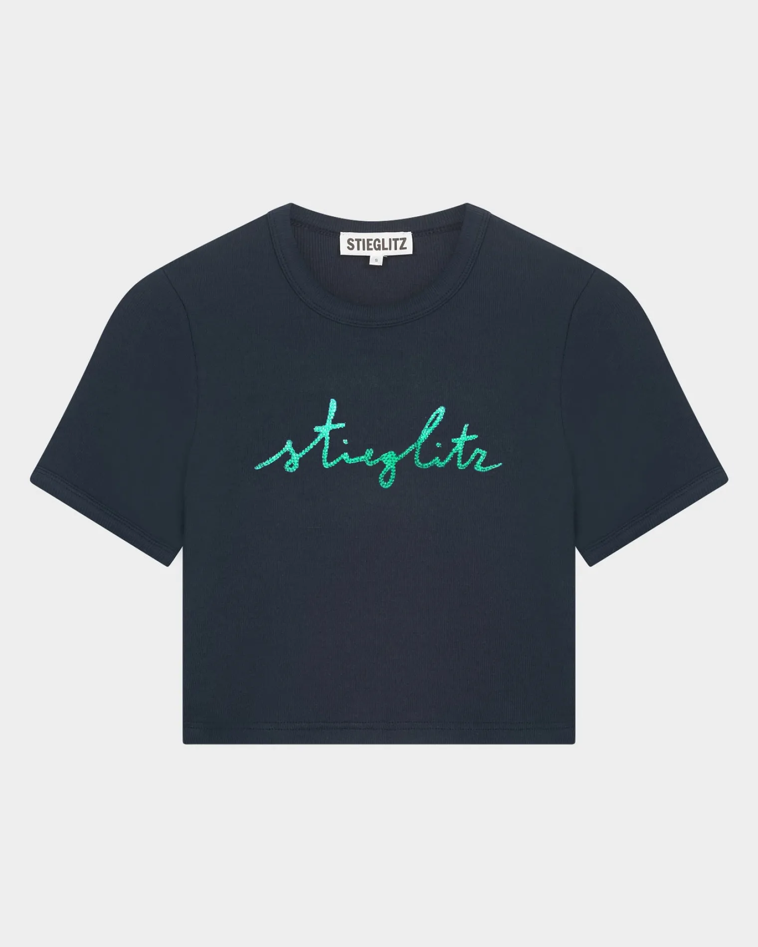 Slip Into The Meya Top, A Cropped Stieglitz Fun Logo T-Shirt. Featuring A Logo Artwork Bedazzled In Green Rhinestones. STand Out And Conquer Your Goals – Meya Will Have You Looking Amazing While You Do It!