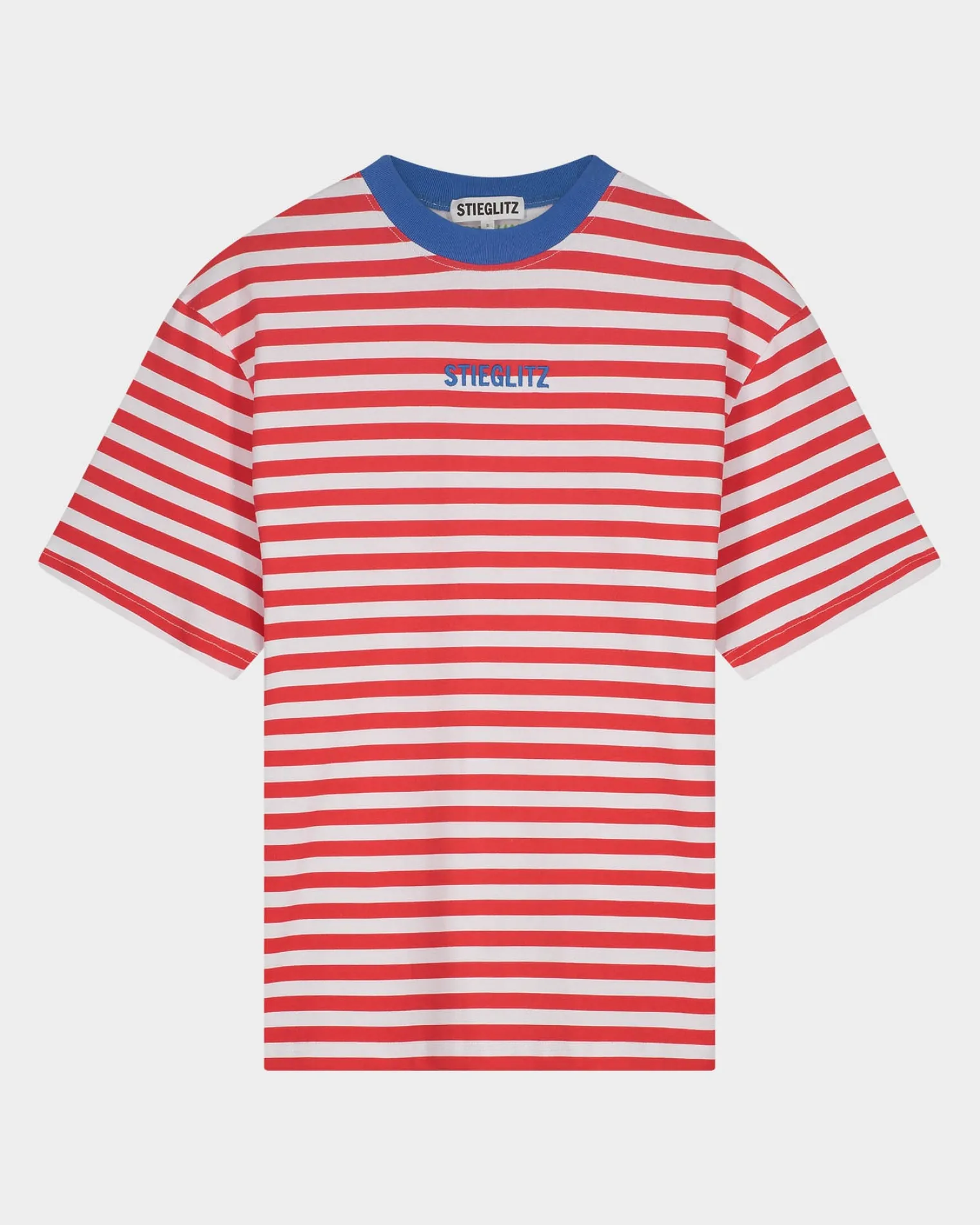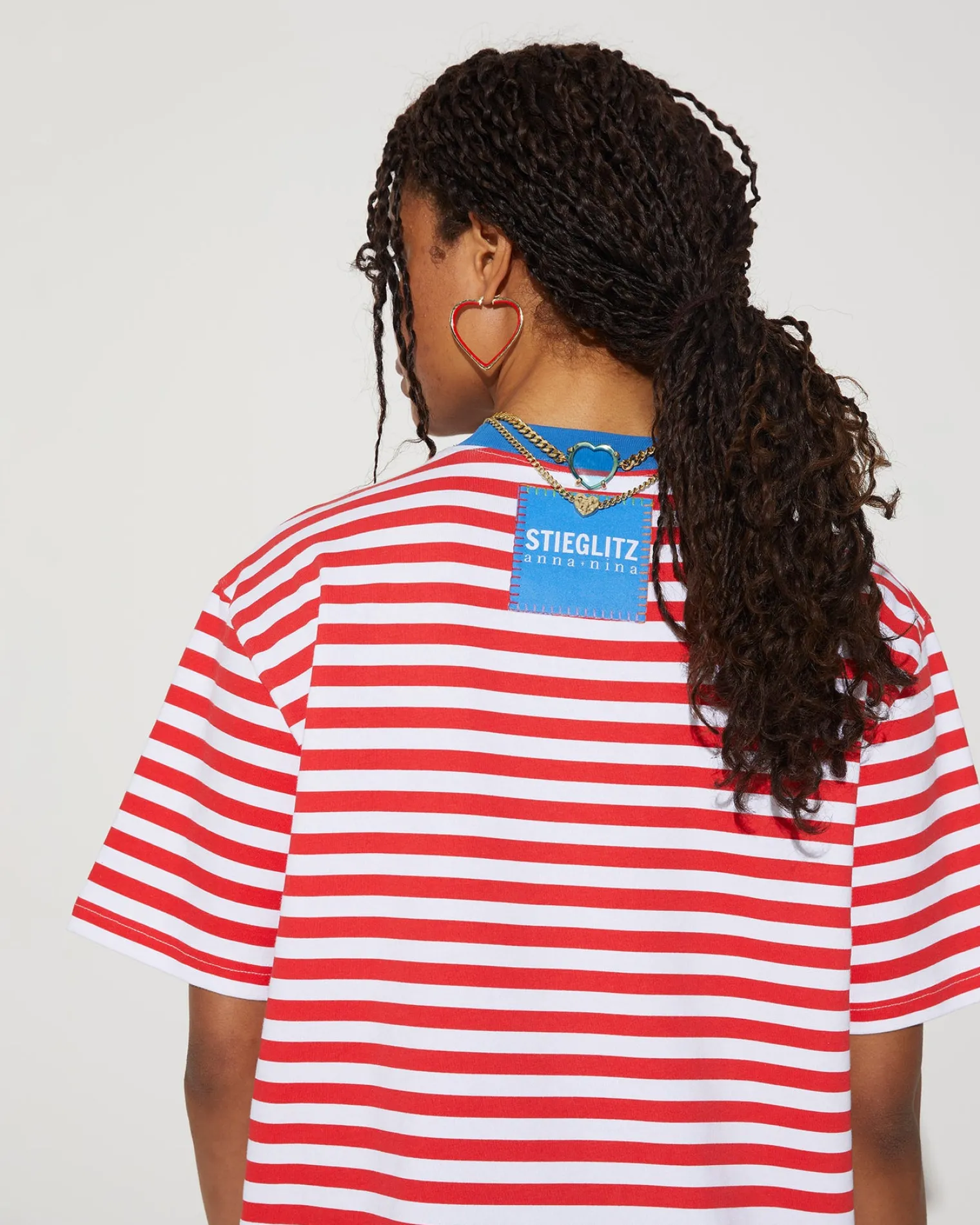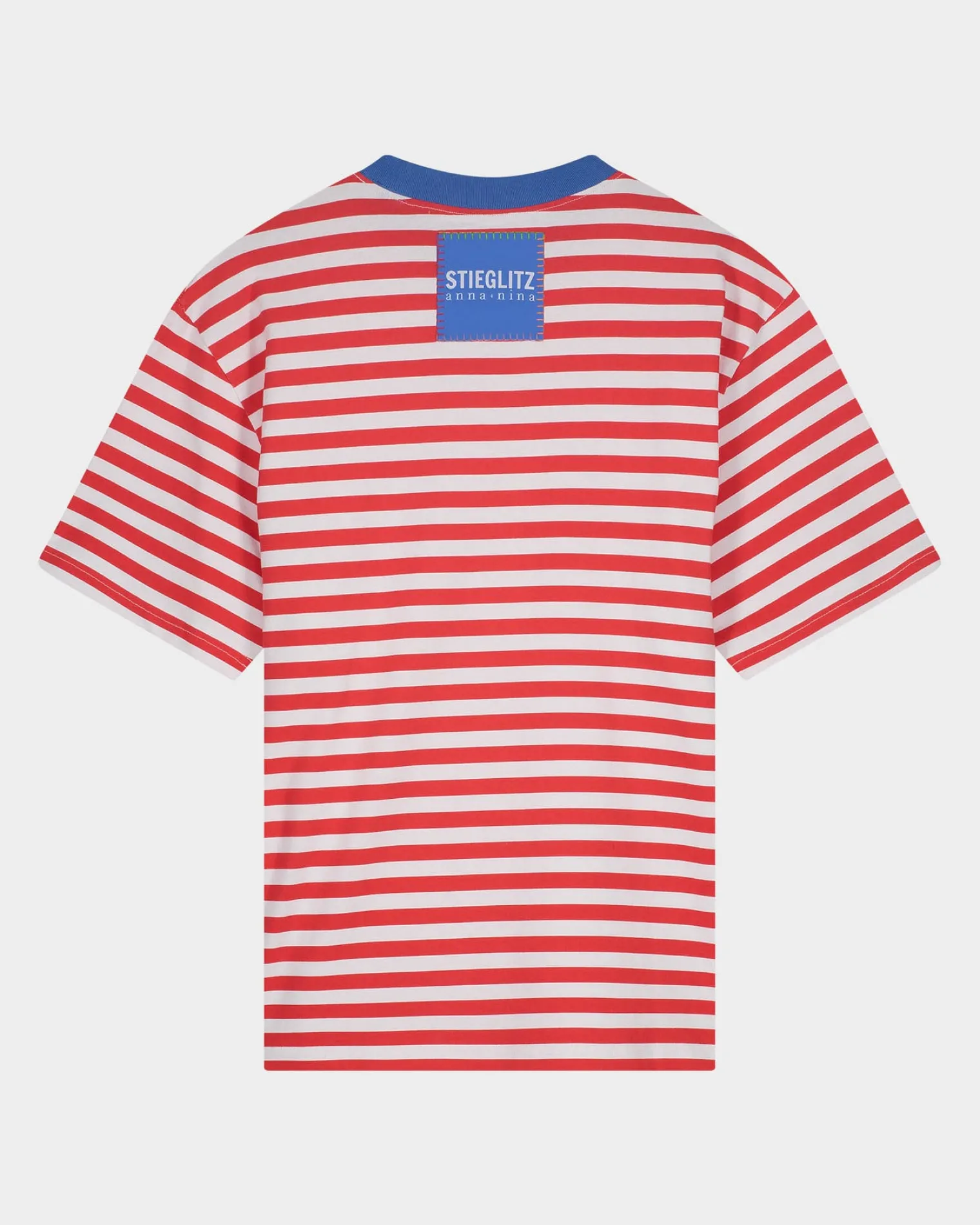 The Striped T-Shirt Is Made Using 100% Cotton. The T-Shirt Has A Red And White Striped Design With A Blue Stitched Front Logo And A Blue Border Around The Neckline. The Back Of The T-Shirt Features The Logo Of Our Anna + Nina Collaboration.