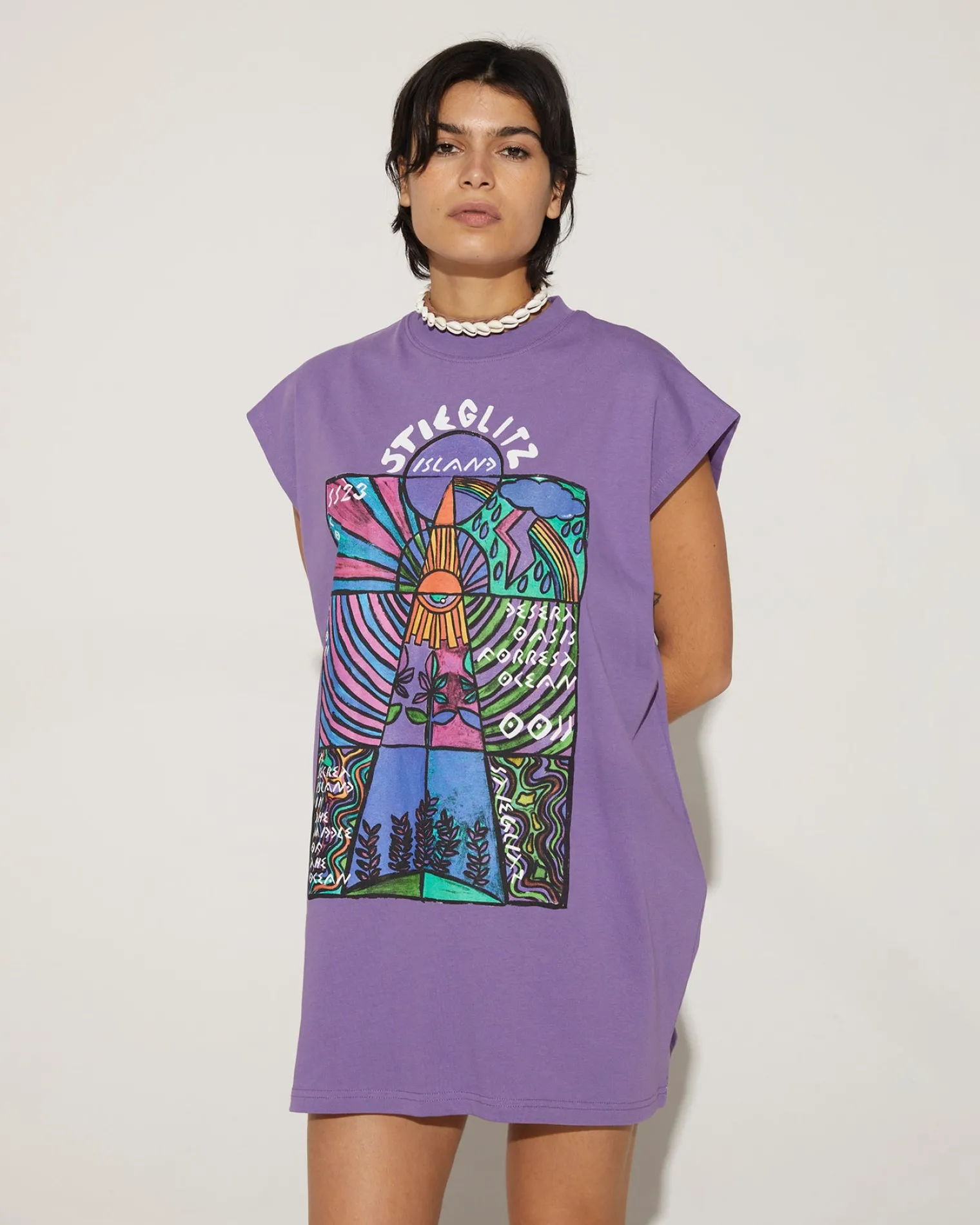 Make A Statement With The Totem Tanktop Dress. Its Oversized Design And Unique Print Will Show Off Your Style, And Give You The Confidence To Take Risks And Stand Out. The In-House Designed Print Strikes Summer On Stiegliltz Island. Show Off Your Long Legs And Make A Statement In This T-Shirt Dress.